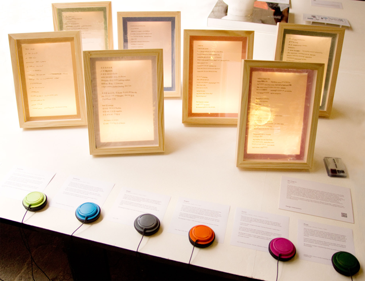 The performance part of the project consists of seven monologues done by seven individuals who are more or less foreign to UK and speak more than two languages, each focusing on one of the emotion categories that I have managed to identify through discussion, workshops, and scientific research references. I chose a second generation Ghana immigrant in London, an Icelandic who has been living in Portugal and works in London, an Iranian who knows the Urdu language which was originally created through a mixture of Persian and Hindi, a Singaporean who grew up using English, Mandarin, Hokkien, and Malay in daily life and is fascinated by Welsh, a Taiwanese whose parents are from France and Taiwan, a Lithuanian who knows Russian because it was a part of USSR, and a Romanian who is doing linguistic research in Computer Science. All of the individuals represent a story that's linked by different languages.